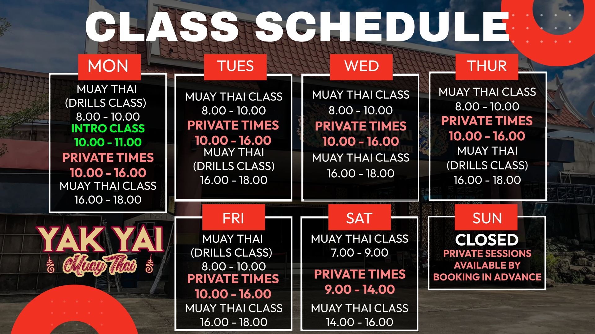• Our Muay Thai Private Sessions times are Monday to Friday from 10:00 am to 4:00 pm and Saturdays from 9:30 am to 2:00 pm. Sundays and Off-hours sessions are available by appointment only and cost 1000 baht — please book private sessions in advance.